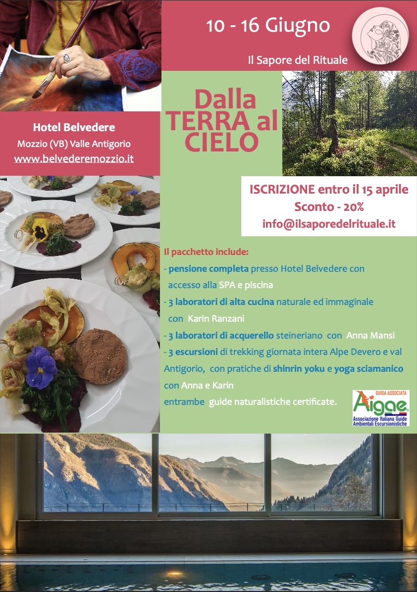 Il ritiro ” Dalla Terra al Cielo” si terrà dal 10 al 16 giugno, 2023, presso Htl. Belvedere, a Mozzio di Crodo (Vb) e dove, Anna e Karin, ti guideranno in un’esperienza di profondo riequilibrio tra corpo, mente ed anima, attraverso le escursioni naturalistiche con pratiche di shinrin yoku tra valle Antigorio e Alpe Devero, i laboratori di acquerello steineriano e di alta cucina naturale curativa ad approccio vegetale, lo yoga sciamanico e l’idroterapia nella SPA dell’ Hotel Belvedere con sessioni di dry brushing,